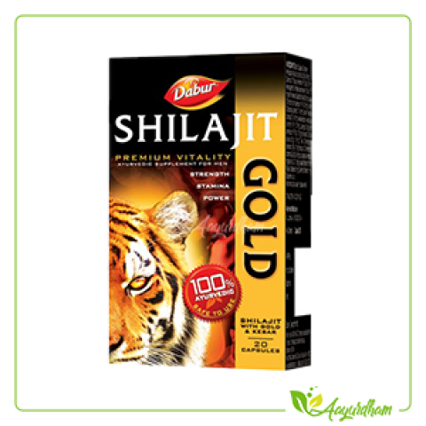 Dabur Shilajit Gold is an ayurvedic medicine for vigor and vitality formulated using a unique combination of medicinal plants like Shilajit, Gold, Kesar, and other important herbs like Ashwagandha, Kaunch Beej and Safed Musali. Shilajit Gold is good for general health and helps increase strength, stamina, vigor, and vitality as recommended by Ayurved in India.