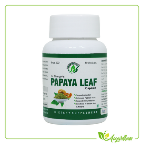 Dr.Bhargav’S Papaya Leaf Capsule Is An Ayurvedic Product With No Side Effects that helps In Raising the Platelet Count In the Body By Removing Toxins From The Blood. It Increases the immunity Level Of the Body, Controls the body temperature.and Is Very Useful In Dengue As It Effectively Increases Blood Platelet Production. It Is Beneficial For All Ages. Result Fortified When It Is Taken With Honey In Conjunction Of Goat Milk.